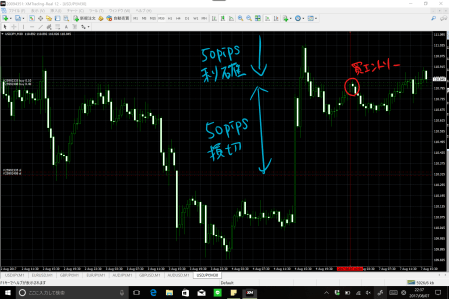 どのくらい幅取ればいいのかわからず、ひとまず欲張って50pipsずつ指値と逆指値に設定しました。